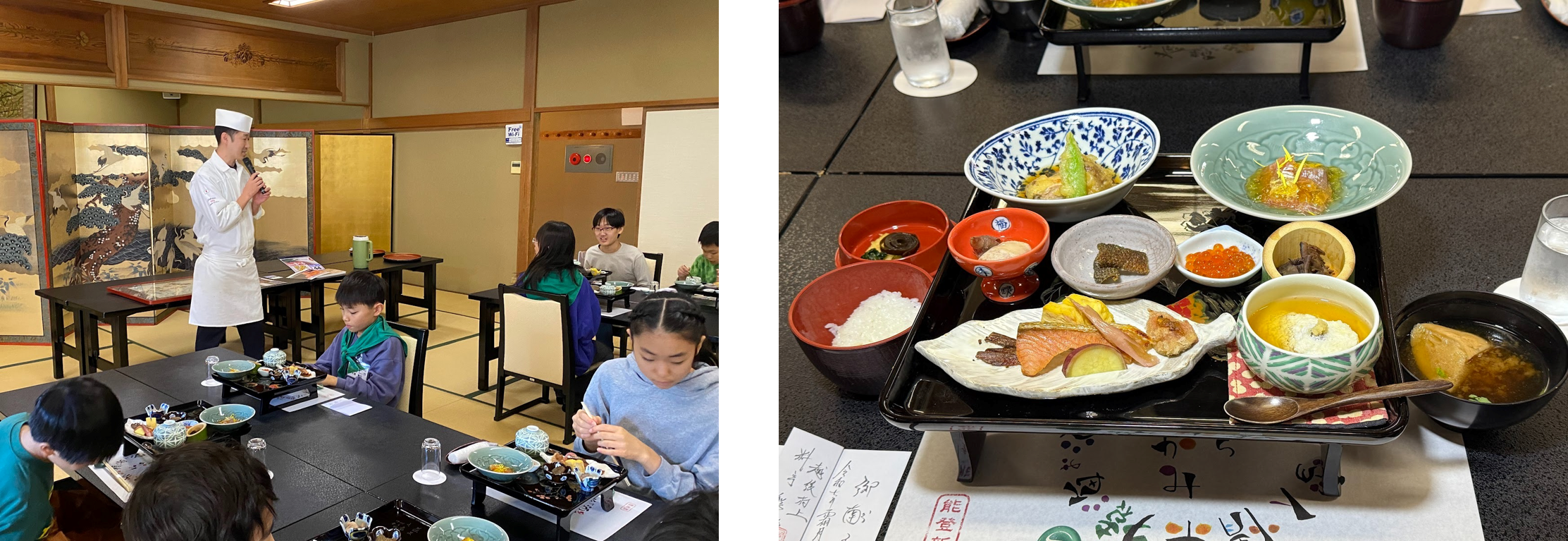 市内の飲食店の中でも歴史のある「料亭・能登新」を訪れ、ワークショップの為に作られた鮭の特別メニューを食しました。皮や骨、肝など、鮭の部位を余すことなく利用した数々の料理。腕を振るった山貝誠料理長からは料理の説明のほか、海の貴重な資源である鮭の有難さについて話して頂きました。子どもたちは一口一口味わいながら、学びを味覚でも体験していました。