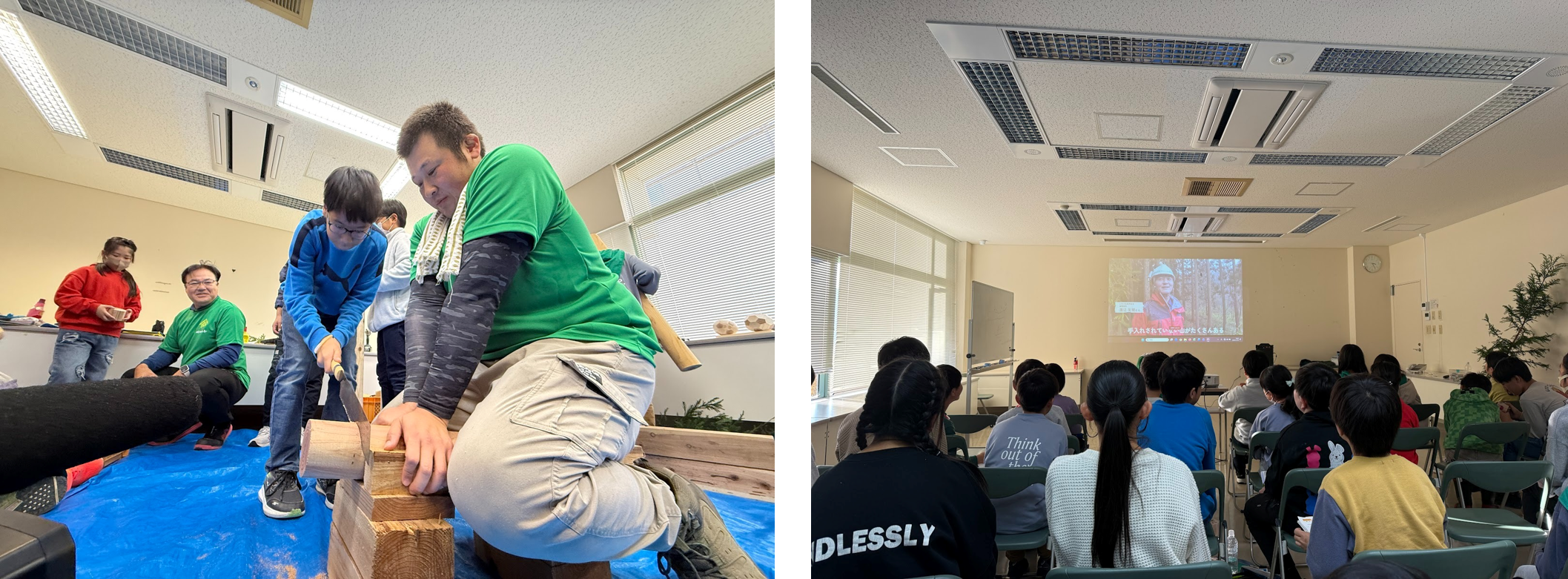 午後は朝日地区公民館に移動して、森林の保全活動や木育活動をしている「次世代の集い」のメンバーと合流。海洋環境に恩恵をもたらす森や川の役割について「次世代の集い」東海林直仁さんから講演がありました。森林の地中の栄養分が川を通して海に供給されることを学び、海・川・森の自然体系の繋がりへの理解を深めました。また子どもたちは、サポートを受けながらノコギリを用いて木材加工に挑戦。オリジナルのペン立てを製作しました。市内で伐採された木材に実際に触れることで、海に恩恵をもたらす森林の重要性について理解を促す機会となりました。