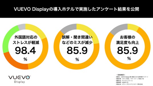 ピクシーダストテクノロジーズ株式会社(本社:東京都中央区、代表取締役会長:落合陽一、代表取締役社長:村上泰一郎、以下PxDT)は、 リアルタイム翻訳ディスプレイ「VUEVO Display(ビューボ ディスプレイ)」導入施設において、スタッフ64名・マネージャー/支配人7名を対象に、外国語対応に関する使用感調査を実施しました。