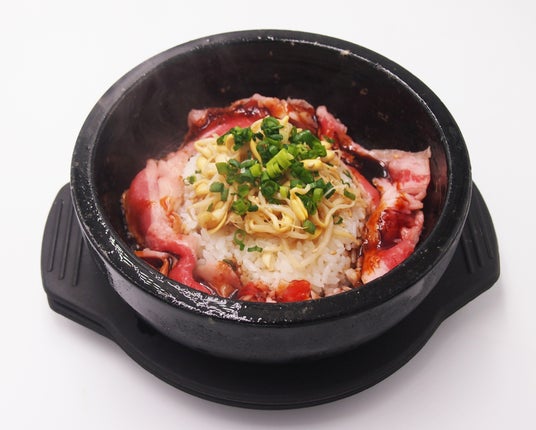 ◆石焼炙りカルビ丼:お焦げも楽しむカルビ丼。石鍋でお肉を焼いてからよく混ぜてお召し上がりください。