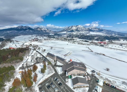 雪化粧の蒜山三座を望む休暇村蒜山高原