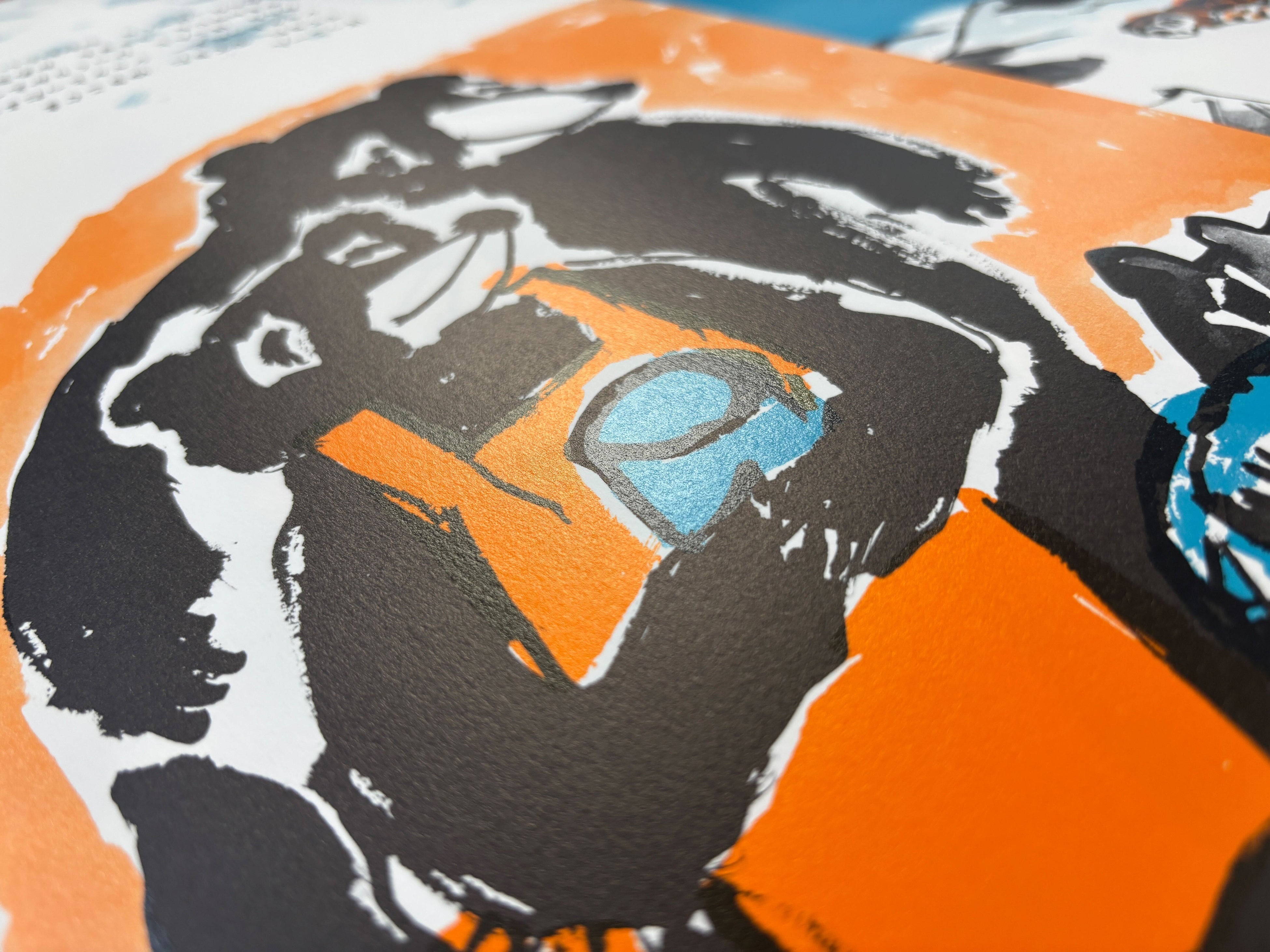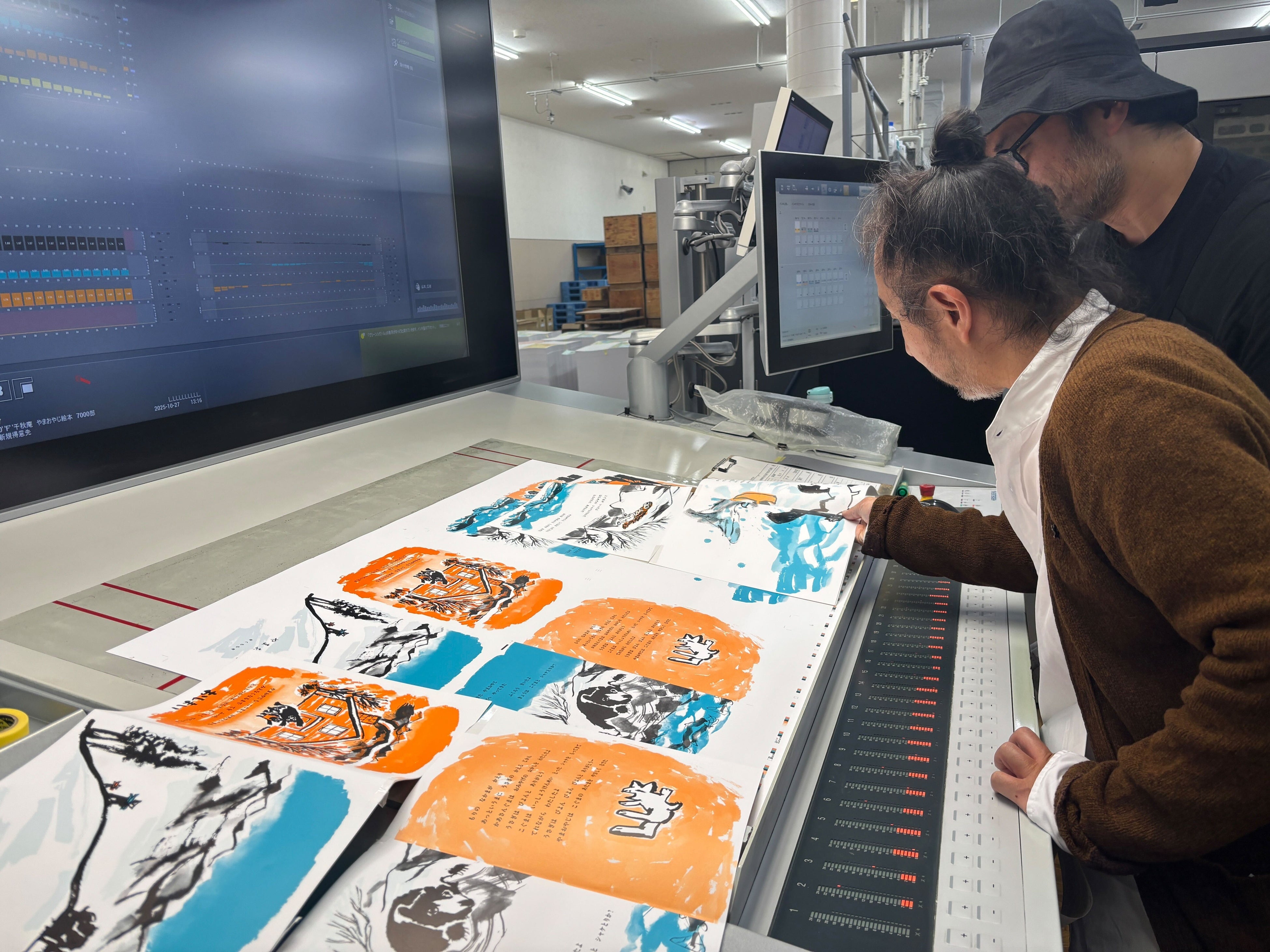 本作は「黒版」「オレンジ版」「青版」の3枚の絵を描き分けて1枚の絵をつくりあげる、独特な印刷技法で制作しています。3枚の絵を重ねることで、動物たちの躍動感や北海道の豊かな自然がより立体的に浮かび上がり、また、雪の存在感を表現するため、ニスを重ね塗り、まるで本物の雪のようにほのかにつやっと輝く、そんな視覚的な楽しさも感じていただけます。筆の質感が活きる風合いのある紙や「紅鮭」という色名の紙を使用するなど、装丁にもこだわりました。