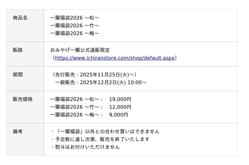 本福袋は、『一蘭福袋2026~松~』『一蘭福袋2026~竹~』『一蘭福袋2026~梅~』の3種類をご用意。定番人気のおみやげ商品に加え、普段はご購入いただけない「有田焼 一蘭謹製 丸どんぶり」や「一蘭オリジナル箸」など、福袋ならではの特別なアイテムを詰め込みました。