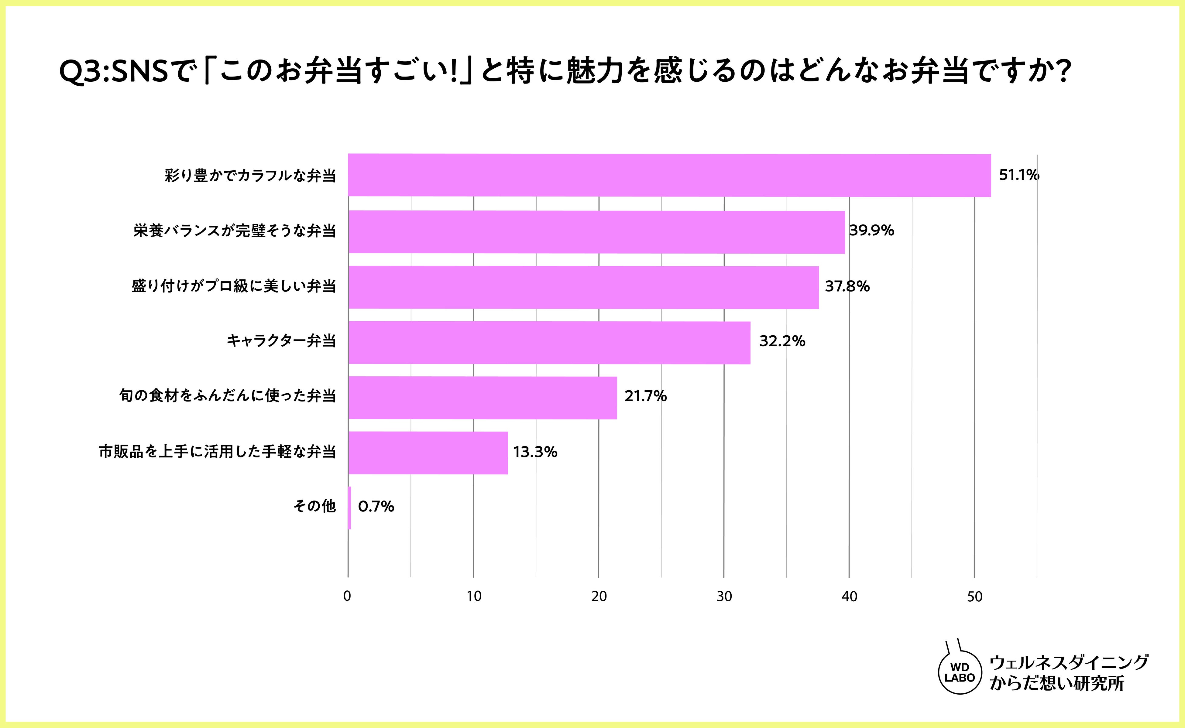 魅力に感じるお弁当は、「彩り豊かでカラフルな弁当」が51.1%と最も多い。次いで「栄養バランスが完璧そうな弁当」が40.0%となり、見た目の華やかさだけでなく、栄養バランスや技術力の高さも「すごい!」と感じる要因であった。