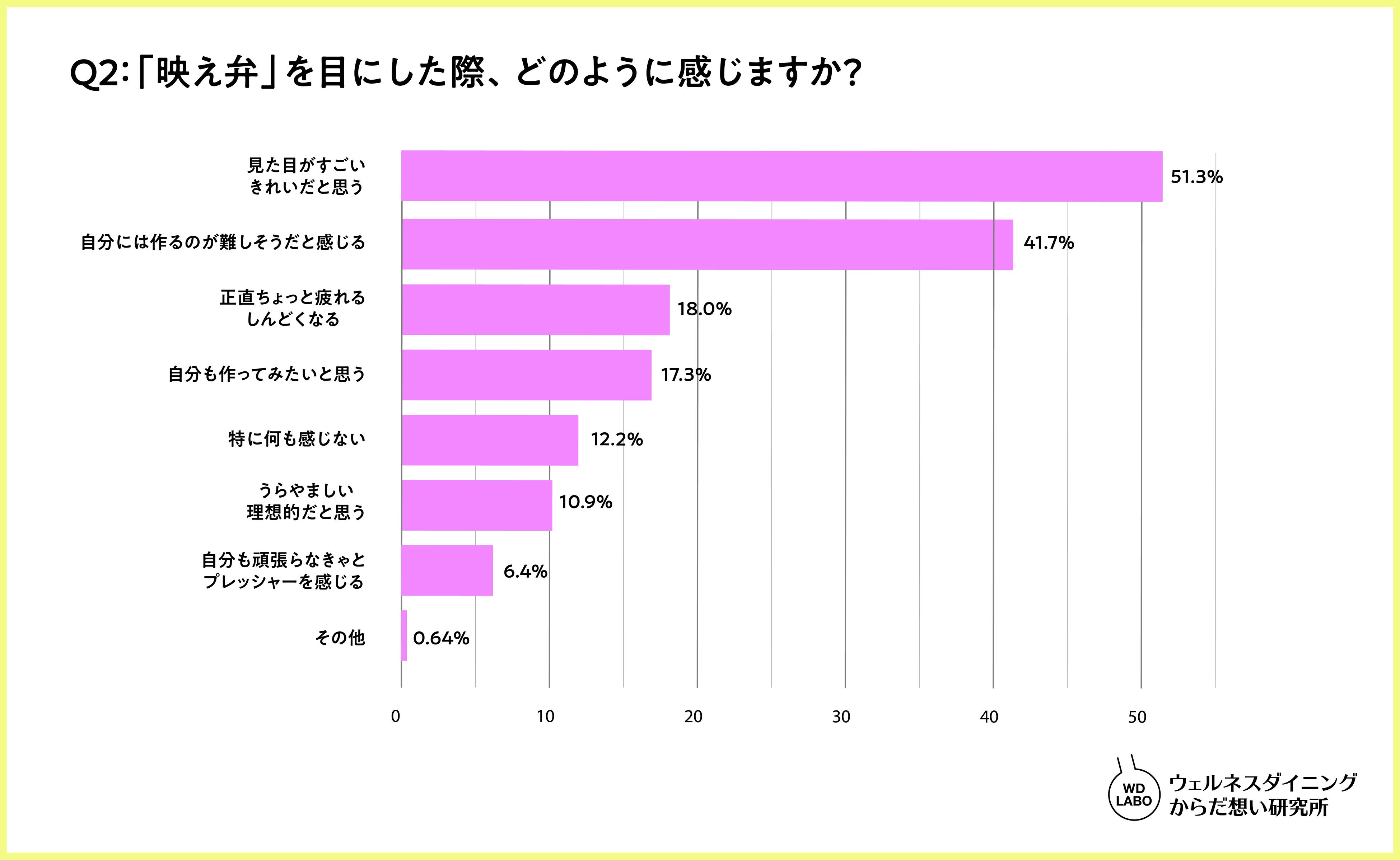 映え弁を見て、「すごい、きれいだと思う」と感じる人が半数以上を占めている。一方で、「自分には作るのが難しそう」と回答した人は41.7%となり、映え弁は憧れであると同時に、プレッシャーや負担感を与える側面もあった。