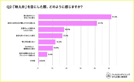 ウェルネスダイニング株式会社(本社:東京都墨田区、代表取締役:中本哲宏)は、全国の20~40代の女性を対象に「映え弁に関する調査」を実施。その結果、半数以上が「見た目がすごい、きれいだと思う」と前向きな印象を持つ一方、「難しそう」「疲れる」と感じる人が4割を超えるなど、「映え弁」に対する憧れと現実のギャップが浮き彫りとなりました。