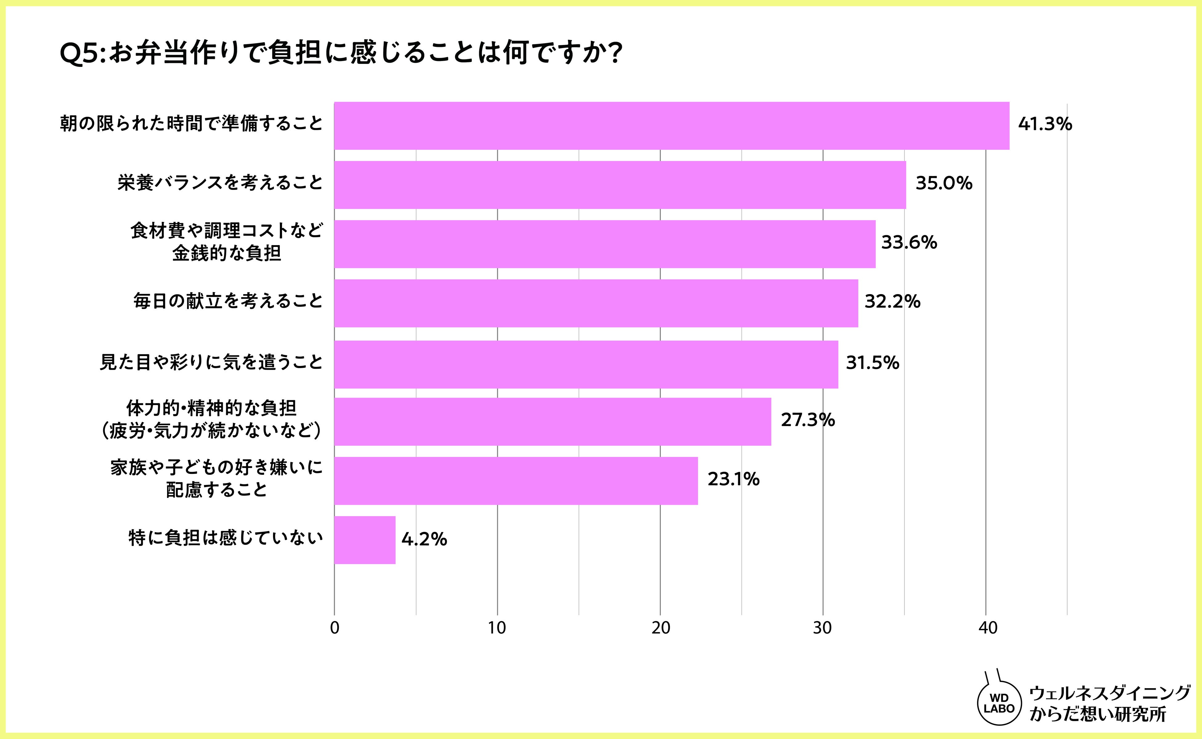 回答者の41.3%がお弁当を作るうえで「朝の限られた時間で準備すること」を負担に感じていた。その他「献立を考えること」、「金銭的な負担」、「栄養バランスを考えること」、「見た目や彩りに気を使うこと」など、様々な項目に回答が分散した。