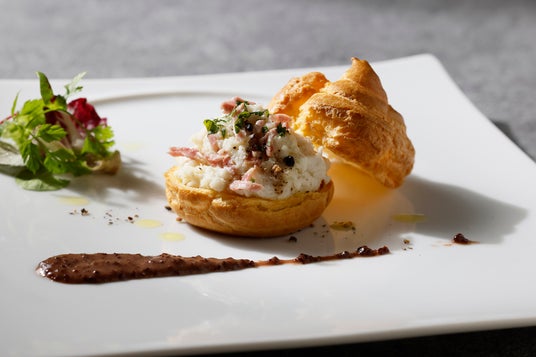 季節の前菜には、「白身魚とイベリコ豚サラミのブランダードグジェール」をご用意。パルメザンチーズを加えて香り高く焼き上げたシュー生地に、白身魚、じゃがいも、牛乳、にんにくを丁寧に練り上げたペーストを詰め、濃厚な旨味が特徴のイベリコ豚サラミをあしらいました。