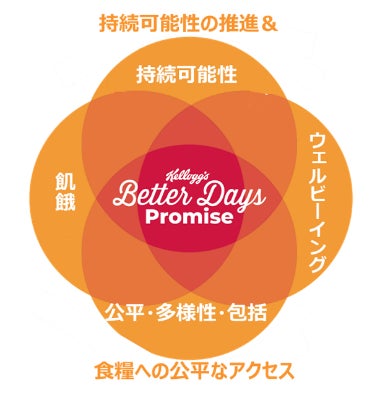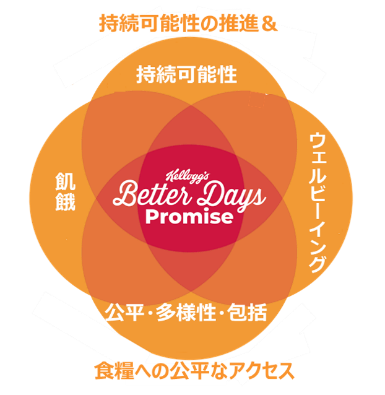 ケロッグでは、グローバルで社会貢献プログラム「Better Days Promise(TM)」を展開しています。本プログラムは、1.飢餓、2.持続可能性、3.ウェルビーイング、4.公平・多様性・包括(ED&I)の4つのフォーカスエリアを軸に、2030年までに世界40億人の人々によりよい日々(Better Days)を実現することを目指しており、当社の「女性活躍推進」に関する取り組みも、このED&I(Equity, Diversity & Inclusion)の柱における主要な取り組みとして位置付けています。