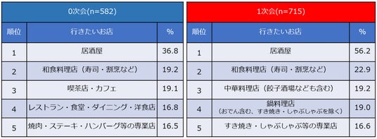 「和食料理店(寿司・割烹など)」は0次会・1次会の両方で2位になり、人気が高いことがわかります。また、「中華料理店(餃子酒場なども含む)」も1次会で3位(19.2%)に入るなど、中華料理店での忘年会も一定の支持層がいることがわかりました。「喫茶店・カフェ」は0次会で3位(19.1%)、2次会で5位(14.4%)に入っており、短時間での利用やクールダウンに使いたいと考えている層がいそうです。