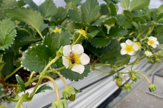 細やかな管理のもと大切に育てられ、可憐な白い花を咲かせ始めた『空浮いちご』