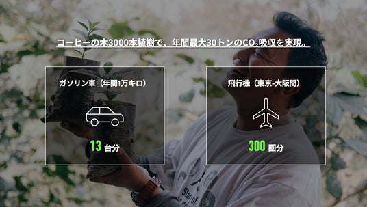 BIKAS COFFEEの植樹プロジェクトは、5年間で累計3,000本の植樹を行い、年間最大約30トンの二酸化炭素(CO2)の吸収の効果が見込まれています※1。このCO2吸収量は、ガソリン車で約10,000km走行する際の排出量に換算※2すると、およそ13台分あるいは東京~大阪間の飛行機の片道移動に換算※3すると300回分に相当し、カーボンオフセット効果を大きく発揮しながら持続可能な農業と経済価値の両立を実現しています。