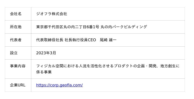 ジオフラは、「Moving Entertainment すべての移動を、新しい発見と感動に。」を掲げ、 「移動」が生み出す経済効果を最大化し、地域の持続的な発展に寄与したいと考え、2023年3月に創業しました。テクノロジーとエンターテインメントの力で人の心を動かし、すべての場所に人が集まる理由をつくり、地域の未来を明るくするというパーパスのもと、すべての移動が新しい発見と感動に変わる世界をつくり、デジタル体験とリアル体験の融合で、新しい価値を生み出し続けるというビジョンを掲げています。これまで多くの地方自治体や法人・企業とのコラボレーションを実施し、地域における人の移動を活性化させ、実際に足を運び、そこでしか得ることのできない価値を創造することで、日本経済、地方経済、地域経済の発展に貢献しています。