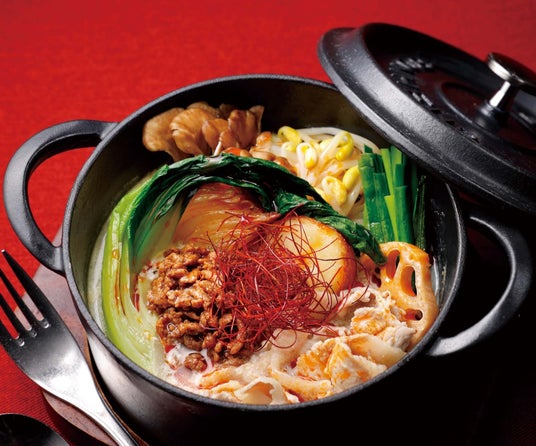 蓮根、チンゲン菜、豆もやし等、冬野菜と豚肉を豆乳仕立ての担々スープで楽しむ冬のごちそう鍋。