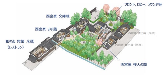 ○フロント、レストラン及び「西宮家 桜人の間」、「西宮家 文庫蔵」、「西宮家 まゆ蔵」「西宮家 武士蔵」、「西宮家 ガッコ蔵」