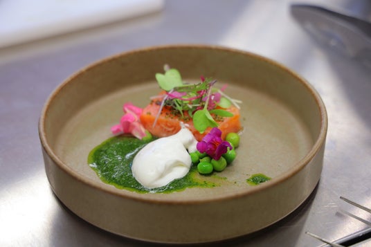 ・いぶり香るサーモン・ミキュイ ~薫香クリームと新緑ソース~(写真:左)