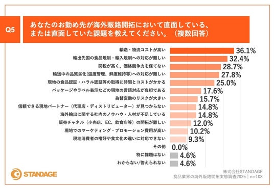 「Q5.あなたのお勤め先が海外販路開拓において直面している、または直面していた課題を教えてください。(複数回答)」(n=108)と質問したところ、「輸送・物流コストが高い」が36.1%、「輸出先国の食品規制・輸入規制への対応が難しい」が32.4%、「関税が高く、価格競争力を保てない」が28.7%という回答となりました。