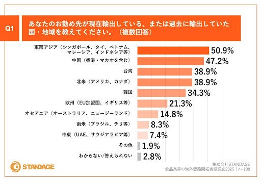 デジタル貿易プラットフォームの開発・提供を手がける株式会社STANDAGE(東京都港区、代表取締役社長:足立彰紀、以下スタンデージ)は、日本国内で食品を海外に輸出している企業、または過去に輸出経験がある企業において、海外輸出・海外販路開拓業務に携わっている方108名を対象に、食品業界の海外販路開拓実態調査2025を実施しましたので、お知らせいたします。