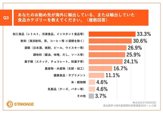 「Q3.あなたのお勤め先が海外に輸出している、または輸出していた食品カテゴリーを教えてください。(複数回答)」(n=108)と質問したところ、「加工食品(レトルト、冷凍食品、インスタント食品等)」が33.3%、「飲料(清涼飲料、茶、コーヒー等 ※酒類を除く)」が30.6%、「酒類(日本酒、焼酎、ビール、ウイスキー等)」が26.9%という回答となりました。
