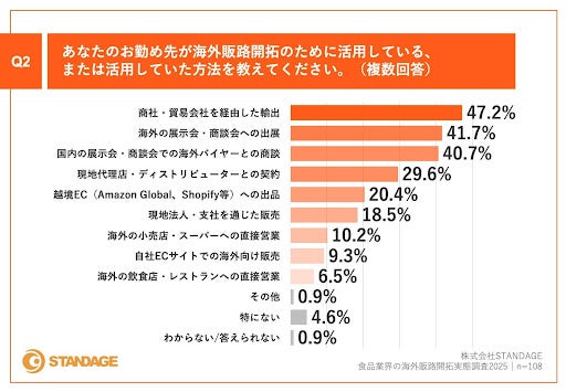 「Q2.あなたのお勤め先が海外販路開拓のために活用している、または活用していた方法を教えてください。(複数回答)」(n=108)と質問したところ、「商社・貿易会社を経由した輸出」が47.2%、「海外の展示会・商談会への出展」が41.7%、「国内の展示会・商談会での海外バイヤーとの商談」が40.7%という回答となりました。