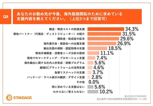 「Q9.あなたのお勤め先が今後、海外販路開拓のために求めている支援内容を教えてください。(上位3つまで回答可)」(n=108)と質問したところ、「輸送・物流コストの削減支援」が34.3%、「現地パートナー(代理店・ディストリビューター)の紹介」が31.5%という回答となりました。