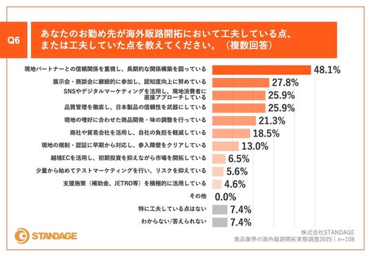 「Q6.あなたのお勤め先が海外販路開拓において工夫している点、または工夫していた点を教えてください。(複数回答)」(n=108)と質問したところ、「現地パートナーとの信頼関係を重視し、長期的な関係構築を図っている」が48.1%、「展示会・商談会に継続的に参加し、認知度向上に努めている」が27.8%、「SNSやデジタルマーケティングを活用し、現地消費者に直接アプローチしている」が25.9%という回答となりました。