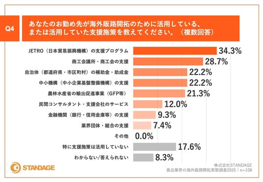 「Q4.あなたのお勤め先が海外販路開拓のために活用している、または活用していた支援施策を教えてください。(複数回答)」(n=108)と質問したところ、「JETRO(日本貿易振興機構)の支援プログラム」が34.3%、「商工会議所・商工会の支援」が28.7%という回答となりました。