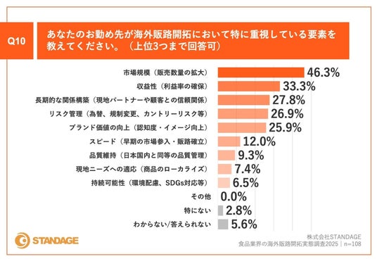 「Q10.あなたのお勤め先が海外販路開拓において特に重視している要素を教えてください。(上位3つまで回答可)」(n=108)と質問したところ、「市場規模(販売数量の拡大)」が46.3%、「収益性(利益率の確保)」が33.3%、「長期的な関係構築(現地パートナーや顧客との信頼関係)」が27.8%という回答となりました。