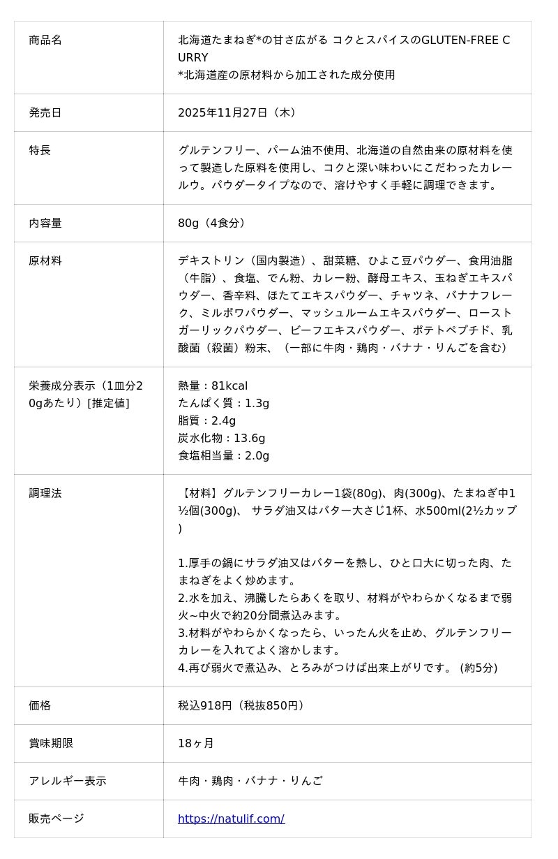 フード・ライフサイエンス事業を展開する株式会社コスモ(本社:東京都中央区、代表取締役社長:佐生 直大)が手掛けるグルテンフリーブランド「natulif(呼び名:ナチュリフ)」は、グルテンフリーでも深いコクと満足感のあるカレーを目指した新商品『北海道たまねぎ*の甘さ広がる コクとスパイスのGLUTEN-FREE CURRY』を、11月27日(木曜日)より発送を開始します。