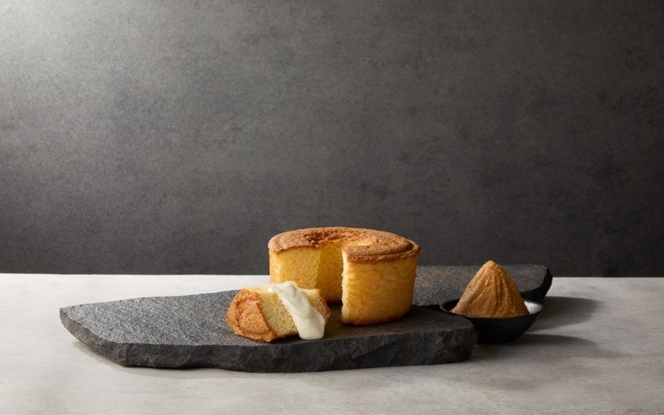 味噌を入れたことでやさしい香りと甘みのシフォンケーキに仕上げました。自社製の「あきたこまち」の米粉や味噌を配合しました。シフォンケーキに添えるマスカルポーネチーズクリームにも自社製の「35こうじ味噌」を加え、味噌の風味を感じて頂けます。