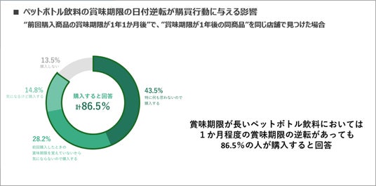 他の食品と比較し、賞味期間が長いペットボトル飲料においては1か月程度の賞味期限の逆転があっても9割近くのお客様が購入すると回答しました。以上のことから、ペットボトル飲料においては、賞味期限の日付逆転がお客様の購買行動に与える影響は限定的と考えられます。