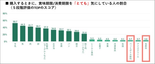さらに、「賞味期限/消費期限をとても気にする」と回答した人の割合は、賞味期限が長い加工食品で3.6%~5.3%と1割に満たないことが分かりました。特に、缶飲料ではアイスクリーム以下、ペットボトル飲料ではアイスクリームと同程度と、ペットボトル飲料と缶飲料は「賞味期限/消費期限をとても気にする」と回答した人の割合が特に少ないことがわかりました。
