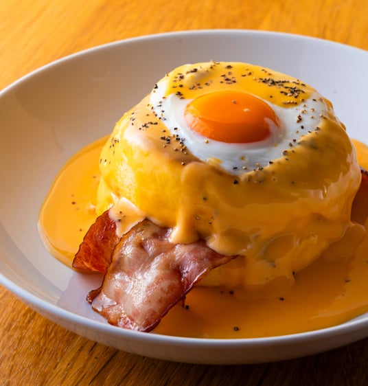 ふわふわな甘いパンケーキに、ベーコンの旨みとチーズのコクをまとわせたカルボナーラソースを合わせた一皿。甘さと塩味が上品に溶け合い、深みのある余韻を楽しめる新感覚のパンケーキです。