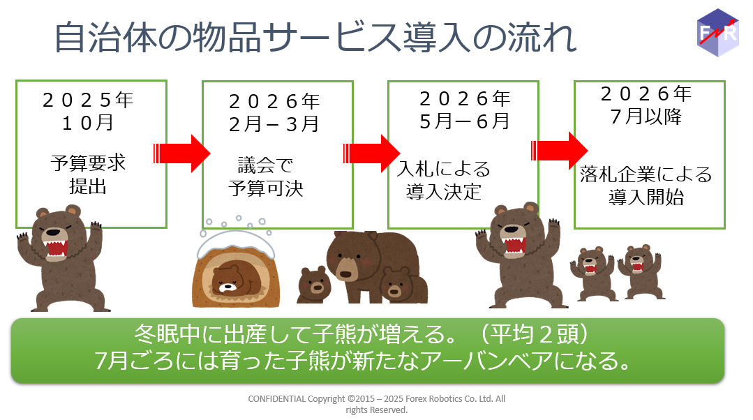 自治体の物品サービス導入の一般的な流れ。クマは冬眠中に子熊を出産するので7月にはアーバンベアが増えてしまう。