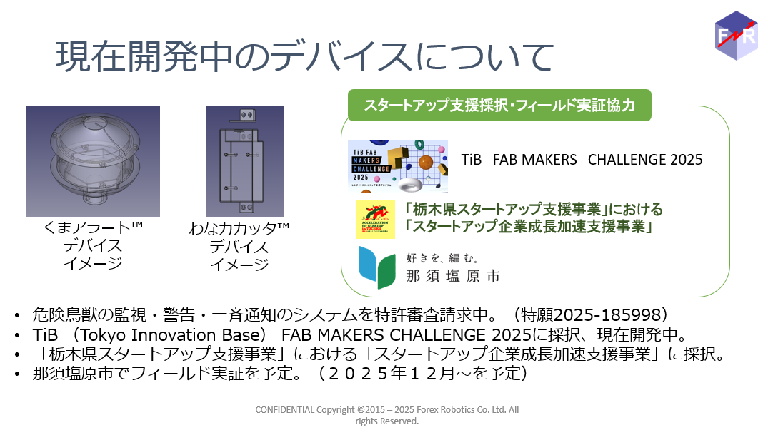 開発・支援状況 現在、TiB (Tokyo Innovation Base) 様、栃木県様のご指導・ご支援をいただき、「くまアラート(TM)」および、スマート罠デバイス「わなカカッタ(TM)」の開発をしており、那須塩原市様のご協力で12月からフィールド実証を実施予定です。
