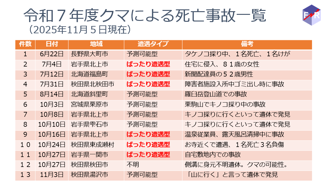 2025年は統計史上最悪のクマの被害数になりました。すでに今年のクマによる死亡事故は11月時点で13名に上り、弊社で被害ケースを精査したところ半数が市街地での「アーバンベア」による「ばったり遭遇型」事故でした。