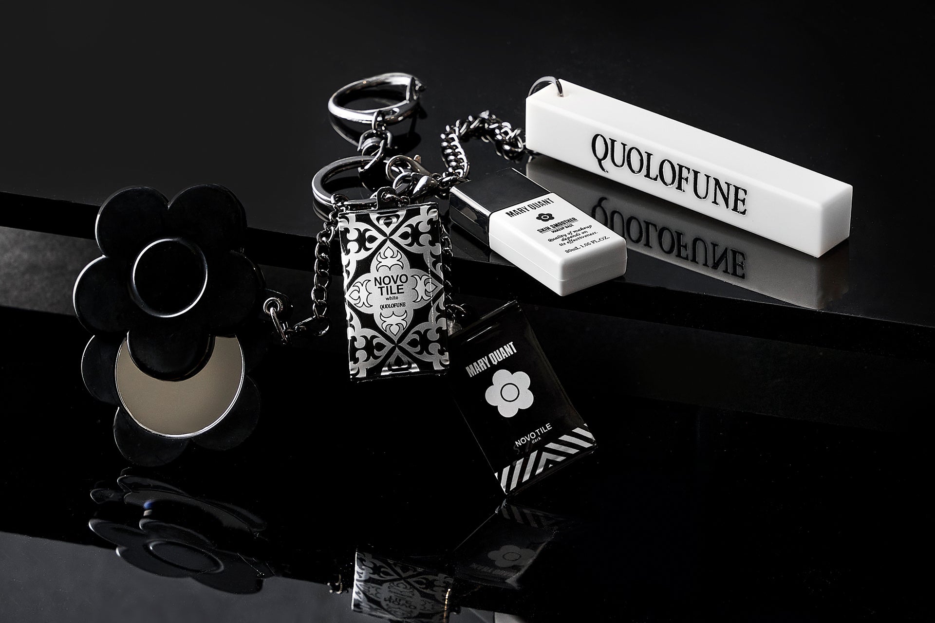 「黒船」と「MARY QUANT」の世界観が融合したコラボレーションチャーム。「MARY QUANT」のブランドのアイコンであるデイジーや、「黒船」のロゴをあしらったチャームは、モノトーンの洗練されたデザインです。