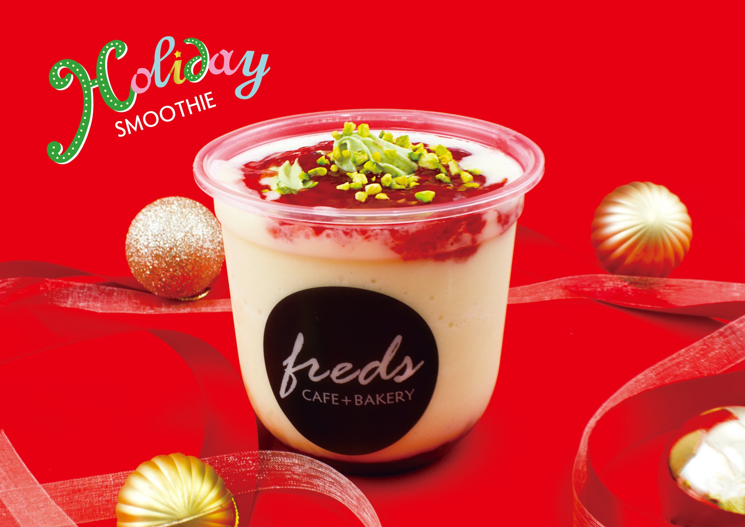 ピスタチオベースのスムージーの底にチョコレートソースを入れ、ラズベリーソース・ピスタチオホイップ・ピスタチオをトッピングしました。ピスタチオの緑にラズベリーソースの赤がホリデー気分を高めるドリンク。よく混ぜてお召し上がりください。