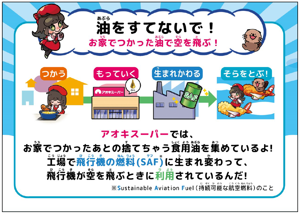日本航空(JAL)と連携して、お客様のご家庭から出る廃食油(使用済みの油)を店頭で回収して、『SAF(持続可能な航空燃料)』にリサイクルする取り組みについて、専用の回収ボトルや回収ボックスの実物を用いて、回収(=リサイクル)できる油・できない油やCO2の削減効果等、わかりやすく学べる授業を実施