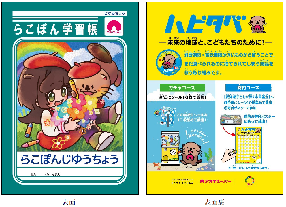 アオキスーパーでは、子ども達が身近に環境問題を意識しつつ、より一層楽しみながら学ぶことができるよう、それぞれの授業のテーマについて分かりやすくまとめた『らこぽん学習帳』を制作し、出前授業で活用しています。