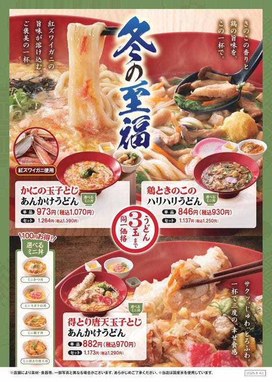 株式会社家族亭(本社:大阪府大阪市、代表取締役執行役員社長: 坪山憲司)が運営するうどんチェーン「得得(とくとく)」では、2025年12月1日(月)~2026年2月28日(土)の期間、身も心もほっと温まる「冬の至福」メニューを販売します。紅ズワイガニの旨みと豊かな風味を味わえる「かにの玉子とじあんかけうどん」や、得得人気のジューシーな「得とり唐天」と玉子あんの相性抜群の「得とり唐天玉子とじあんかけうどん」など、この季節ならではのぜいたくな味わいを、得得自慢のうどんとともにお楽しみいただけます。もちろん、得得名物の 『うどん3玉まで同一価格』。寒い季節にこそ、熱々の一杯でお腹も心も満たしてください。