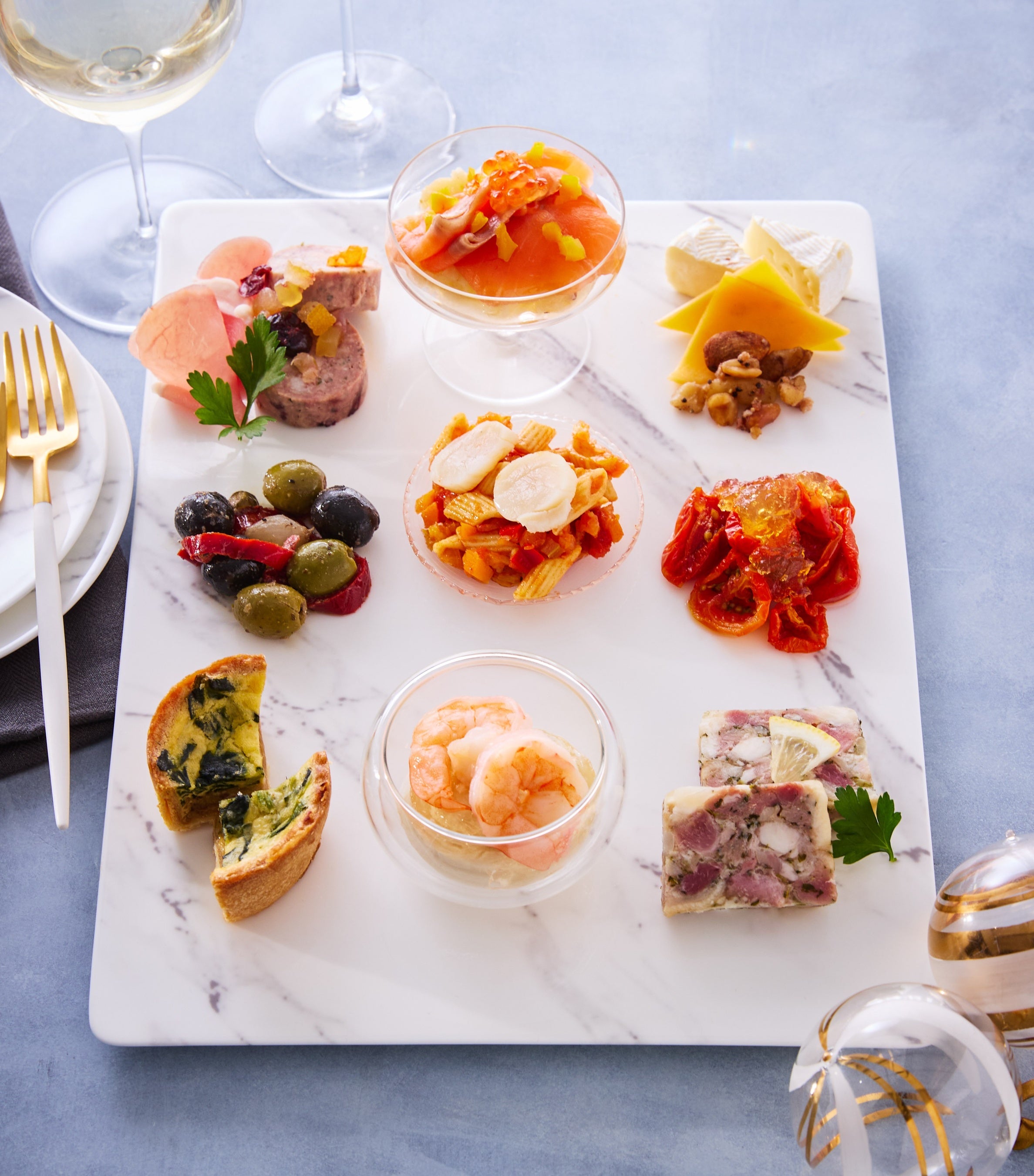 目にも美味しい彩りの、風味豊かな品々を詰め合わせた華やかな前菜プレート。