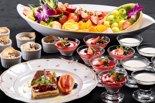 華やかな冬のスイーツが並ぶデザートコーナーでは、彩り豊かなスイーツを多数ご用意しております。可愛らしい見た目とやさしい甘さが魅力の「カップケーキ」は、ひとつひとつ丁寧に仕上げた冬限定の一品。冬の訪れを感じさせる真っ白な「ホワイトチョコケーキ」や、ベリーの酸味と甘さが絶妙な「ベリーロールケーキ」、りんごを使った「シブースト」、コクのある「ベイクドチーズケーキ」など多彩なスイーツが並びます。さらに、旬の果実を贅沢に盛り合わせたフレッシュフルーツもラインナップ。見た目にも華やかなスイーツが、食後のひとときをより豊かに彩ります。