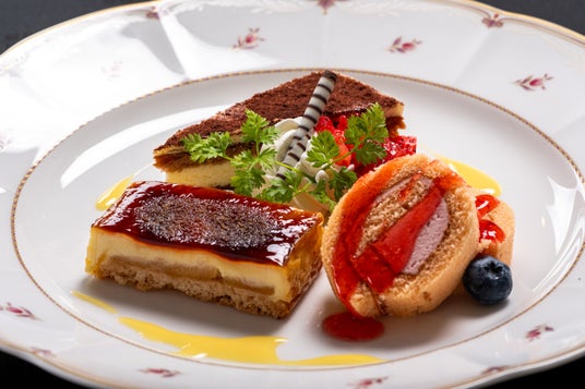 【デザート】ホワイトチョコケーキ/ベイクドチーズケーキ/ベリーロールケーキ/北海道フロマージュケーキ/ティラミスケーキ/紅茶シフォンケーキ/りんごのシブースト/キャラメルプリン/プリン/コーヒーゼリー/イチゴケーキ/プチシュー/わらびもち/カップケーキ