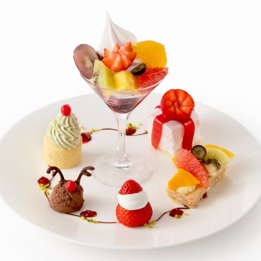 果実とスイーツが織りなす、クリスマスの小さな舞台。ひそやかに煌めく、甘い世界の一幕です。ひと口ごとに広がる甘さはまるでクリスマスギフトをそっと開く瞬間のときめきのように胸が踊ります。