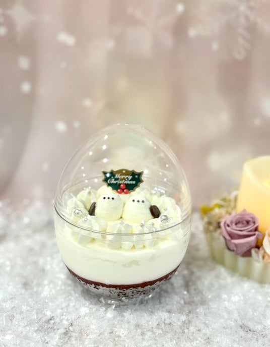 店内での通常ケーキはいつもより少し大きめ!スノードーム風シマエナガケーキです。苺とミルク、チョコレート味!(こちらのケーキは店内飲食のみです)