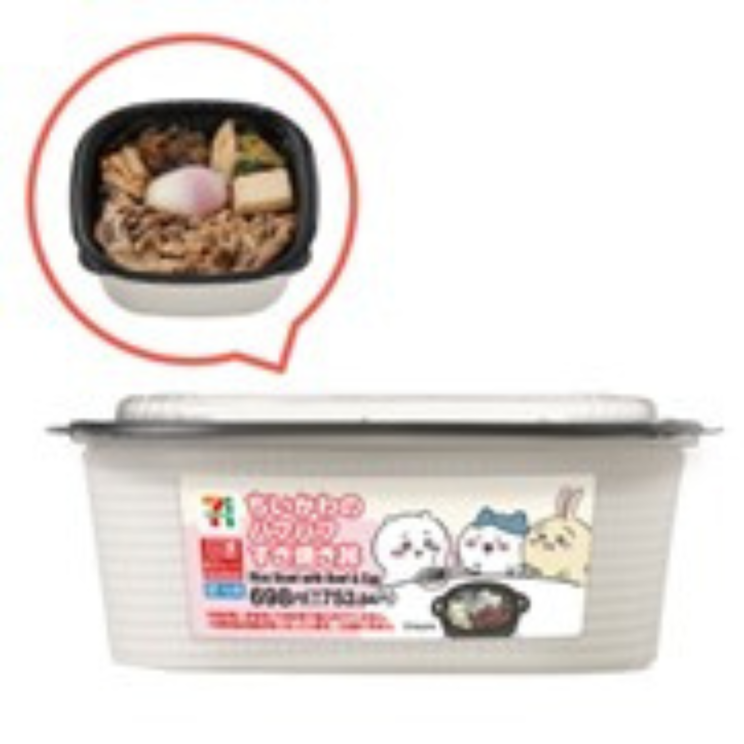 ちいかわが当選したすき焼きセットをイメージした商品。甘じょっぱく味付けした牛肉と野菜をふんわり煮込み、仕上げに温泉玉子をのせました。