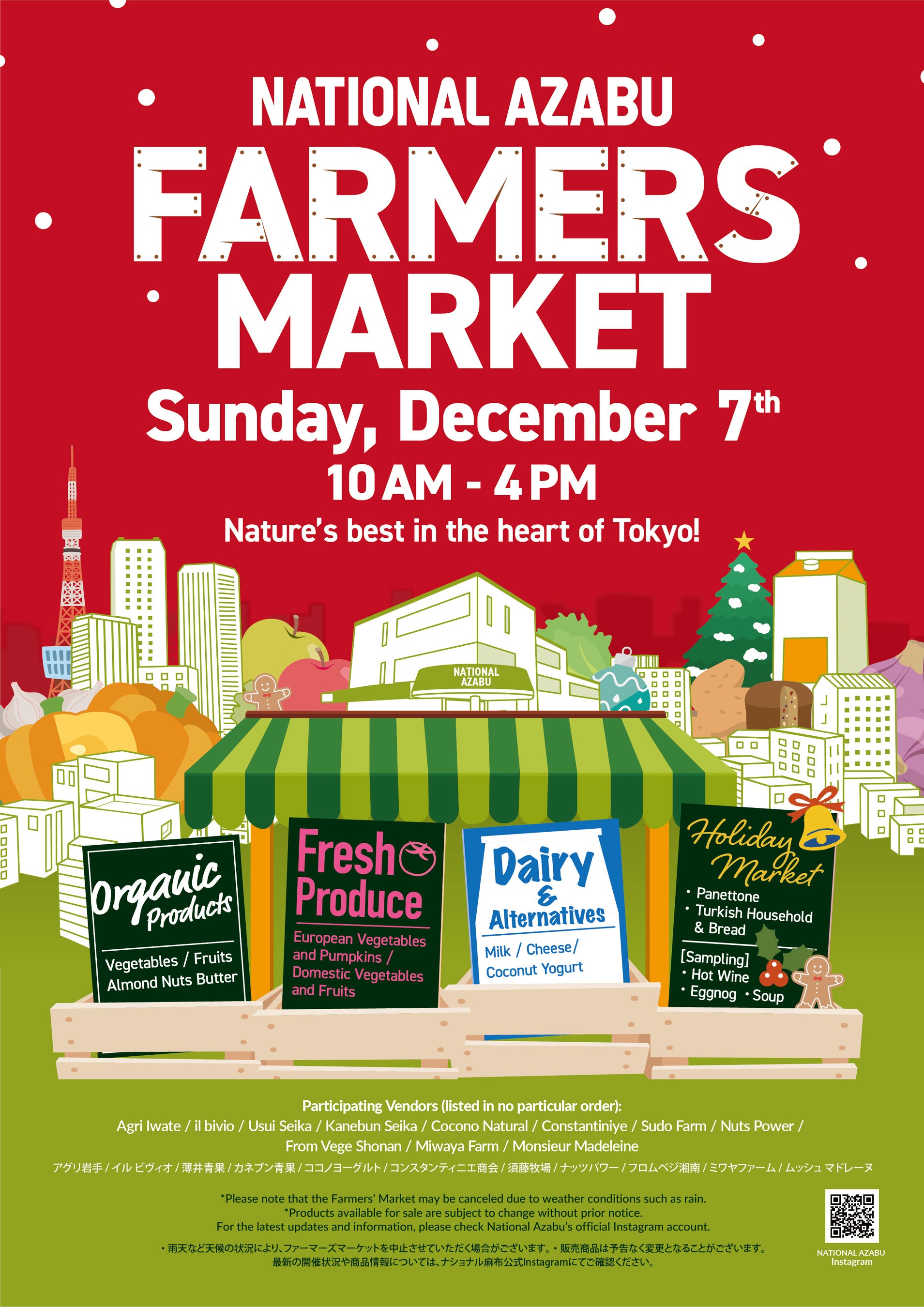 ナショナル麻布株式会社(本社:港区南麻布4-5-2、代表取締役社長:安原利彦)が運営するインターナショナルスーパーマーケット「ナショナル麻布」本店にて、広尾エリアの活性化と多文化交流を目的とした「NATIONAL AZABU FARMERS MARKET」を12月7日(日)に開催いたします。