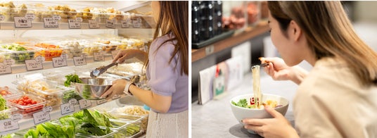 店内の冷蔵ケースに並べられた野菜や具材からお好きなトッピングを選び、ボウルに入れてスタッフにお渡しください。(どれをお選びいただいても1g 3.1円)