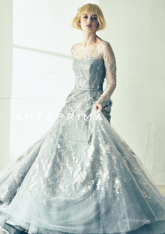 アンテプリマで不動の人気’シルバー”。こちらのコレクションでは、シルバーにほんのりグレージュをプラスし、トレンド感を取り入れつつ、色の幅を広げました。華美すぎず、絶妙な輝きのオリジナルグリッターには、ANTEPRIMAフィオーリを巧みにレイアウトして、ブランドの個性を際立たせています。さらに、取り外し可能なロングスリーブ付きのヨークが肌を美しく包み、透明感を演出。同素材で作られたコサージュは自由にアレンジ可能です。